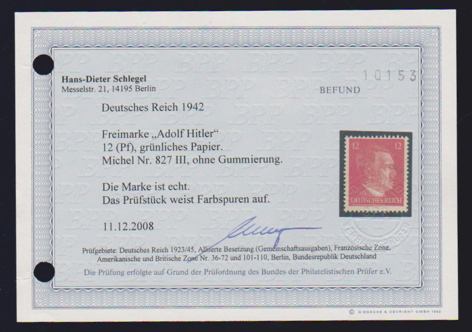 12 Pfg. Hitler auf gutem grünlichem Papier ungebraucht (Farbspuren), Fotoexp. Schlegel