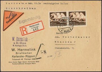42 + 108 Pfg. Braunes Band im Paar als gute MeF auf R-NN-Doppelbrief eigenhändig von Neuhausen/Wtbg. 1943 nach München