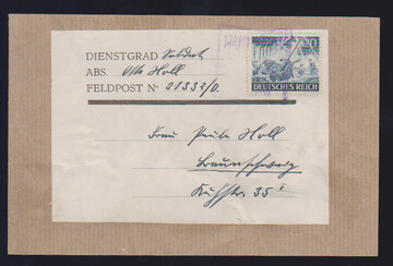 20 + 14 Pfg. Wehrmacht I als gute Einzelfrankatur auf Feldpost-Päckchen-Adresse mit Ra3 "Bei der Feldpost aufgeliefert"