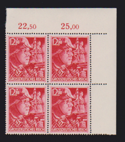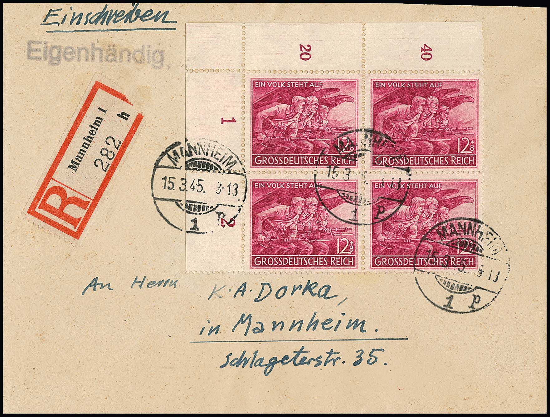 12 + 8 Pfg. Volkssturm im Viererblock aus der linken oberen Bogenecke auf Orts-R-Brief "Eigenhändig" aus Mannheim 1945