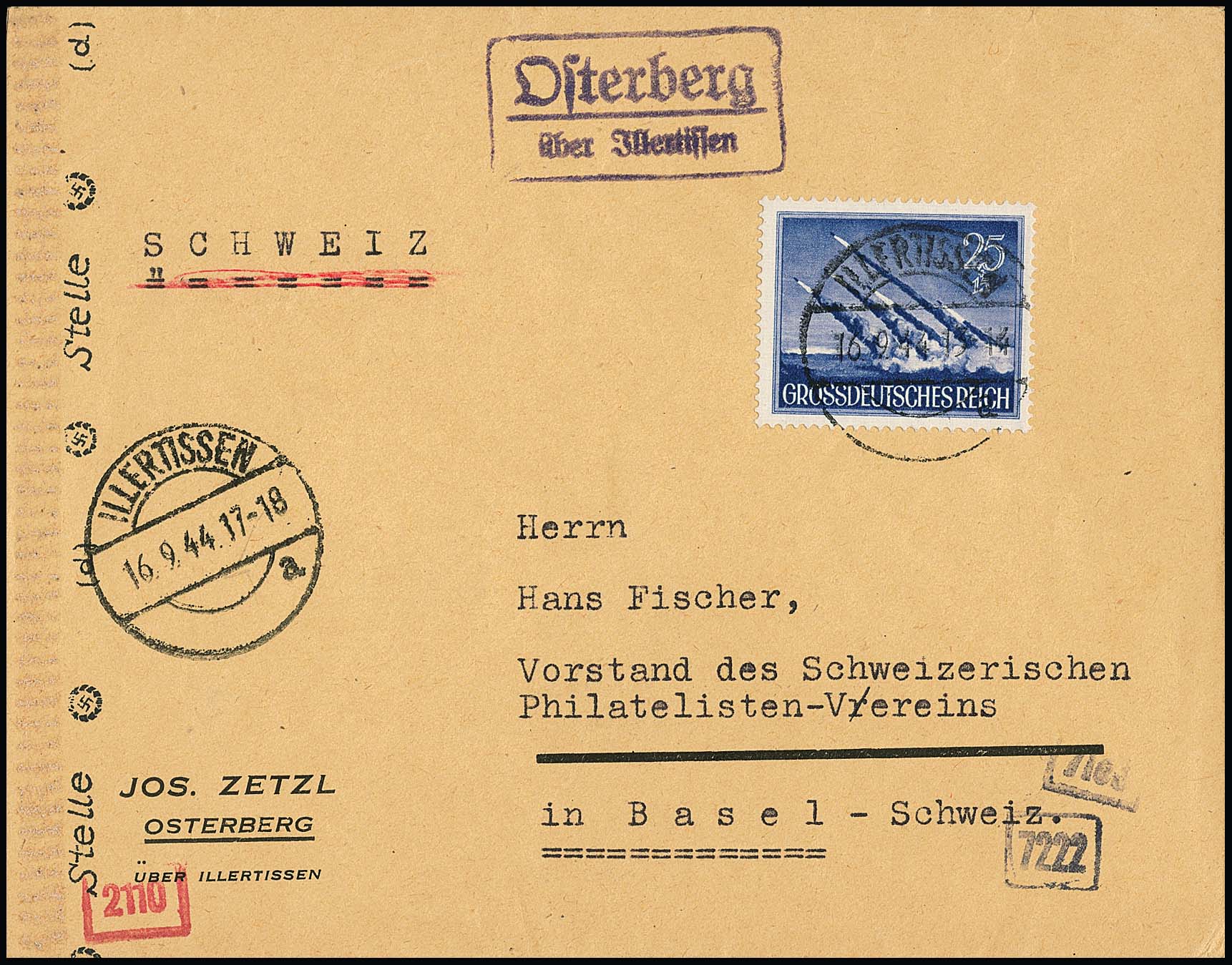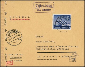 25 + 15 Pfg. Wehrmacht als portoger. Einzelfrankatur auf Zensur-Auslandsbrief (von der PHS "Osterberg über Illertissen") in die Schweiz