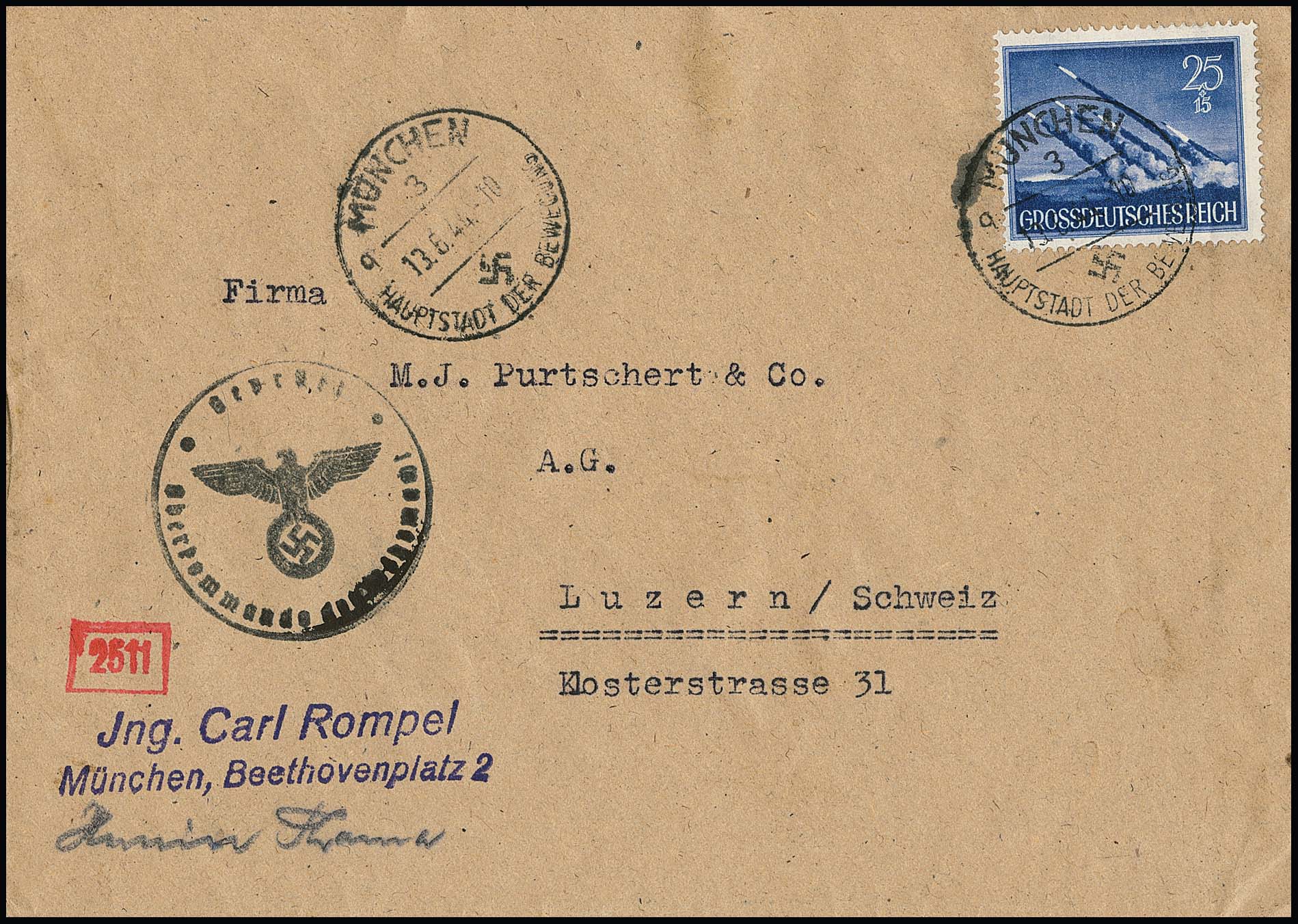 25 + 15 Pfg. Wehrmacht II als gute Einzelfrankatur auf Zensur-Auslandsbrief von München 1944 in die Schweiz
