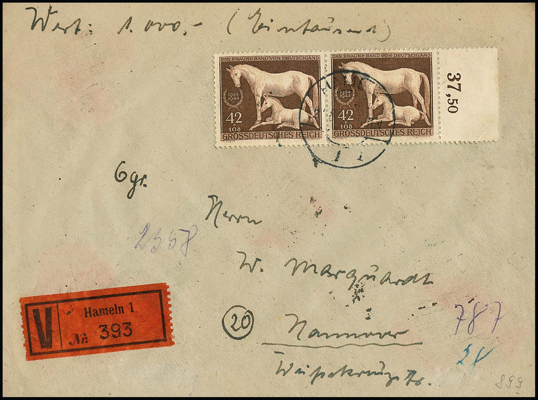 42 + 108 Pfg. Braunes Band im Randpaar als gute Mehrfach-Frankatur auf Wertbrief (rs. Siegel entfernt) aus Hameln 1944