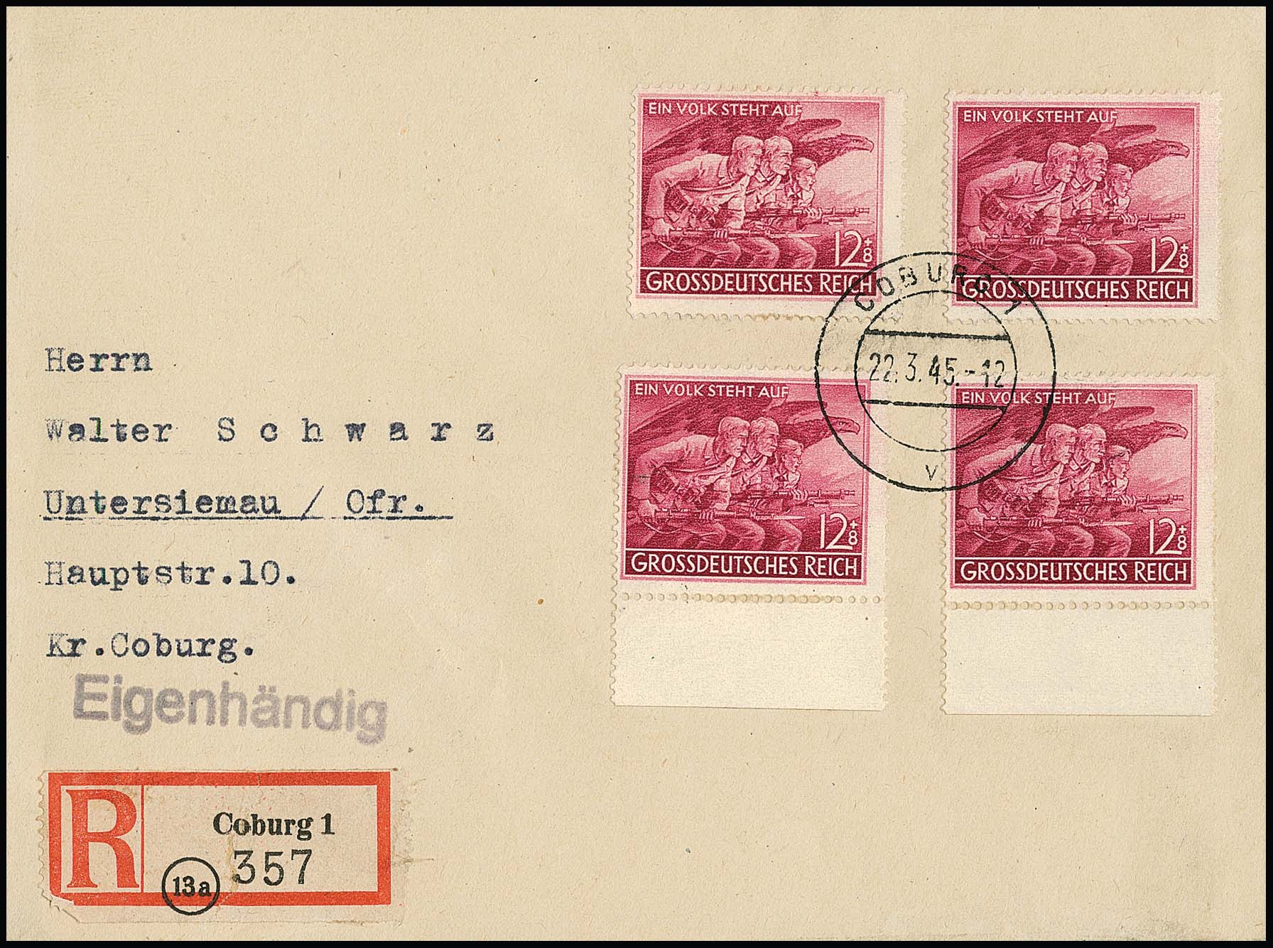 12 + 8 Pfg. Volkssturm per vier als gute MeF auf Orts-R-Brief eigenhändig (Couvert zweiseitig geöffnet) aus Coburg, 22.3.45