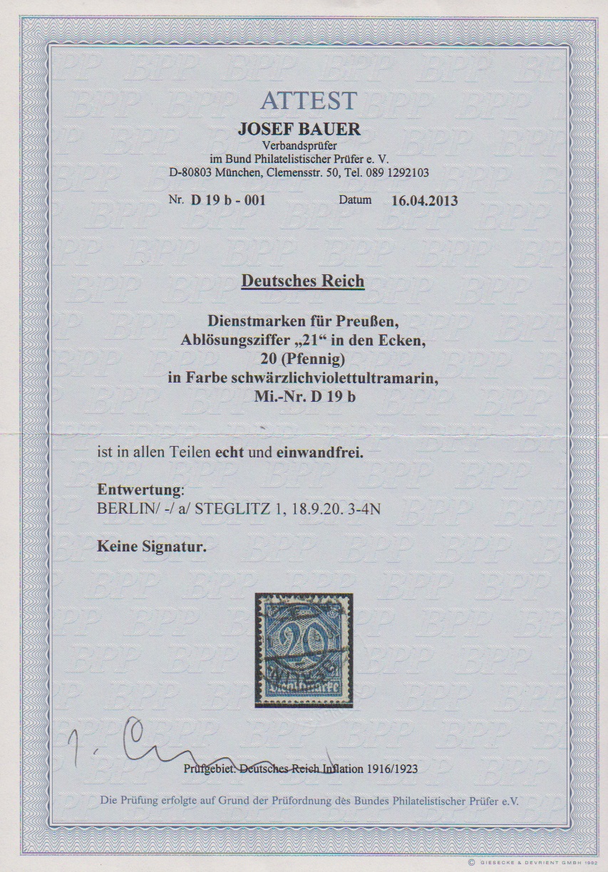 20 Pfg. in guter Farbe preußischblau tadellos und zentrisch gestempelt "Berlin", Attest Bauer. Mi. 950,-