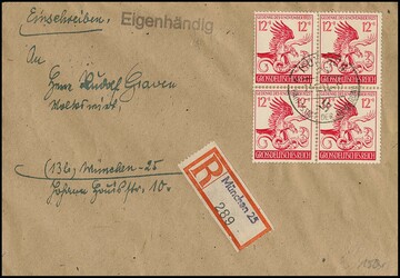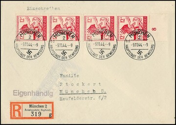 12 + 8 Pfg. 9. November im Viererblock auf Orts-R-Brief "Eigenhändig" aus München 1944