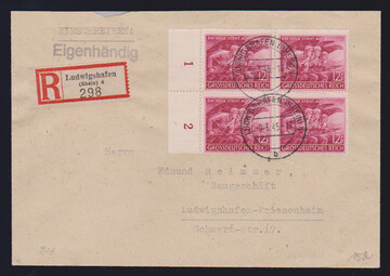 12 + 8 Pfg. Volkssturm im Viererblock vom Rand, dabei Plattenfehler IX auf Feld 6, auf Orts-R-Brief "Eigenhändig" aus Ludwigshafen 1945