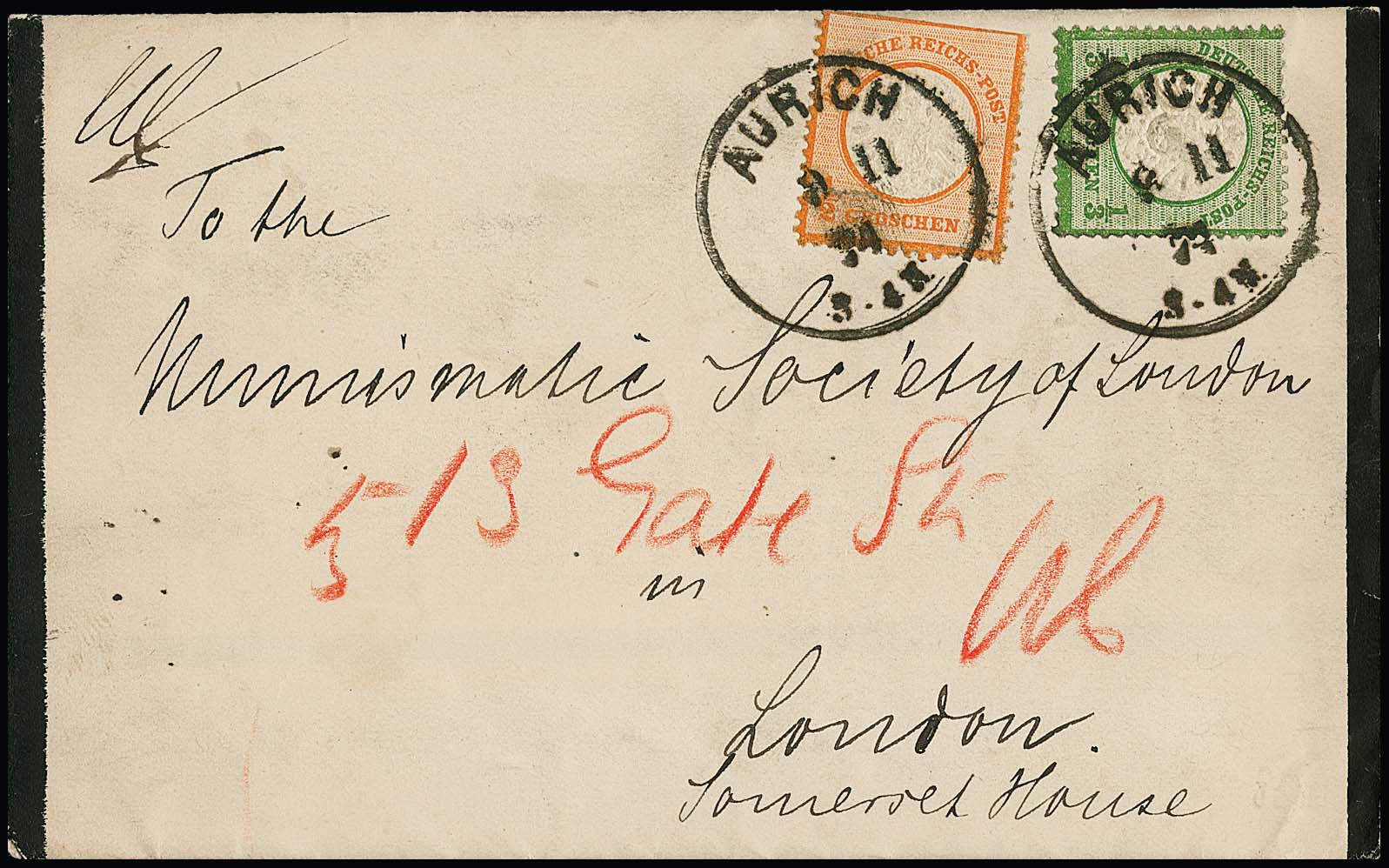 1/3 Gr. geblichgrün und 1/2 Gr. orange (oben Schere) als kuriose Überfrankatur auf Auslands-Drucksache von Aurich (K1) 1874 nach London