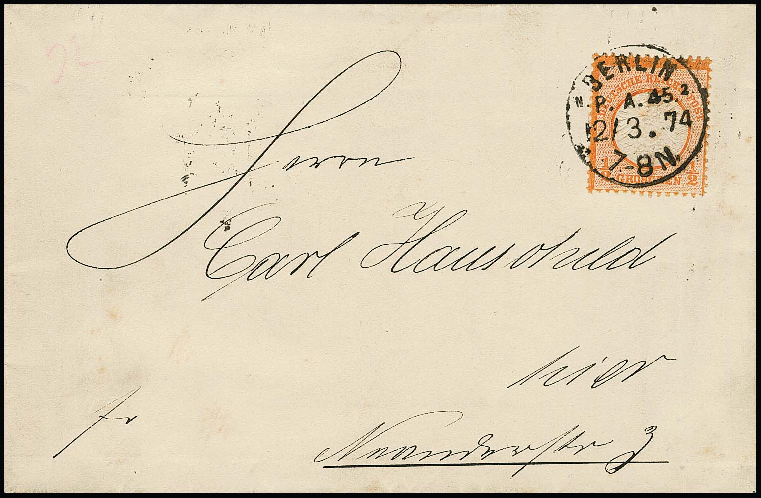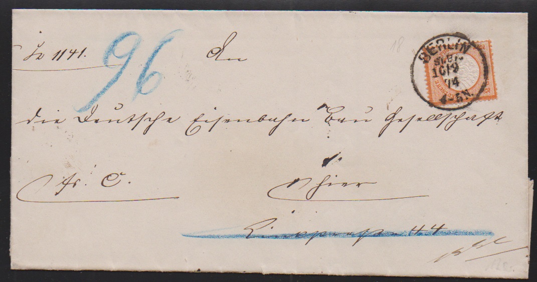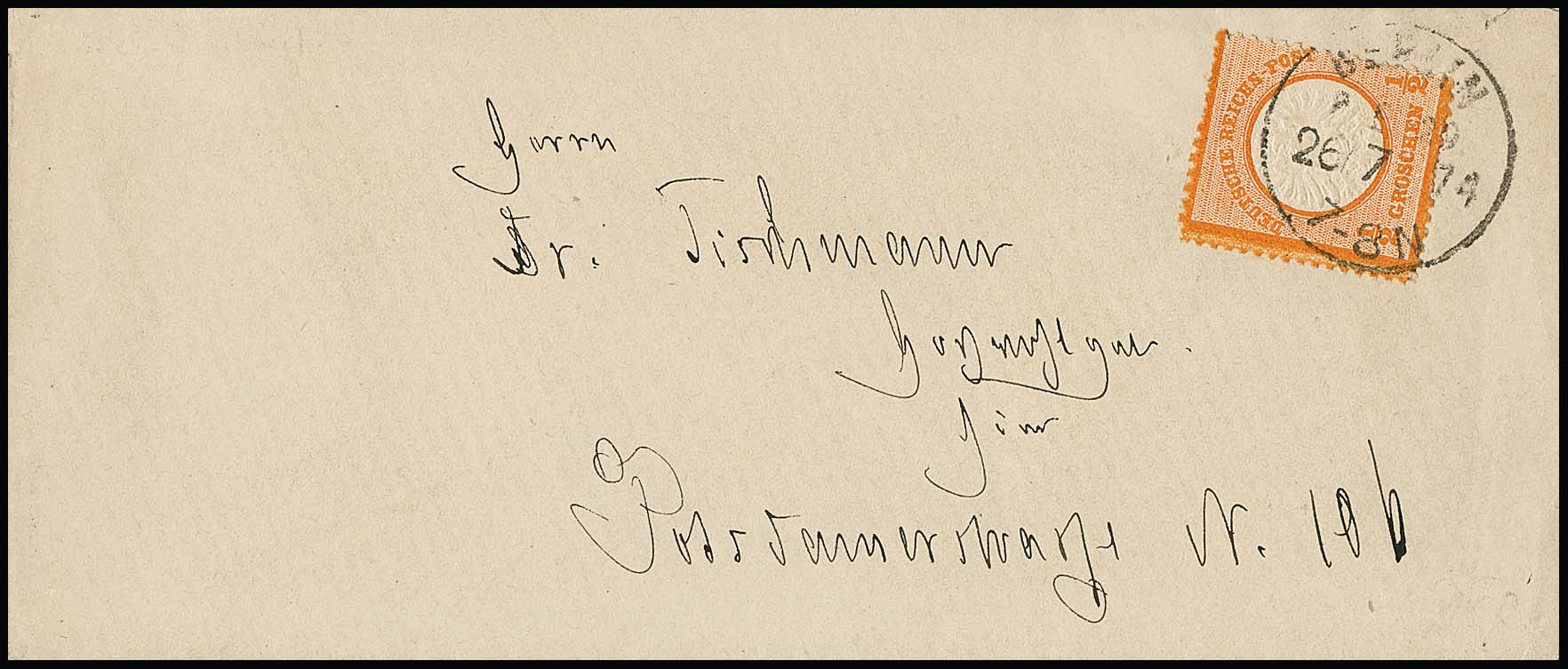 1/2 Gr. orange, Kabinettstück einzeln auf Ortsbrief mit seltenem K1 "Berlin N. P.A. 45. 2" (ermäßigte Gebühr ab 25 Sendungen), sowie auf Ortscouvert mit Ra3 "Reichenbach i. Sachsen" vom Ersttag der Pfennigzeit, 1.1.1875