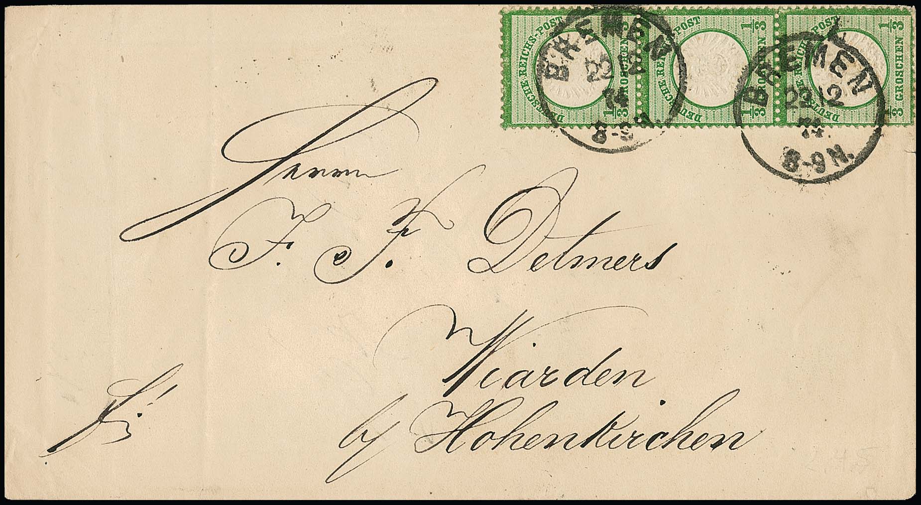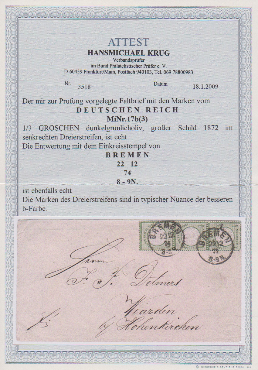 1/3 Gr. dunkelgrün, gut gezähnter senkrechter Dreierstreifen (untere Marke leichte Druckstelle) auf Brief von Bremen 1874 nach Wiarden, Attest Krug. Mi. 900,-