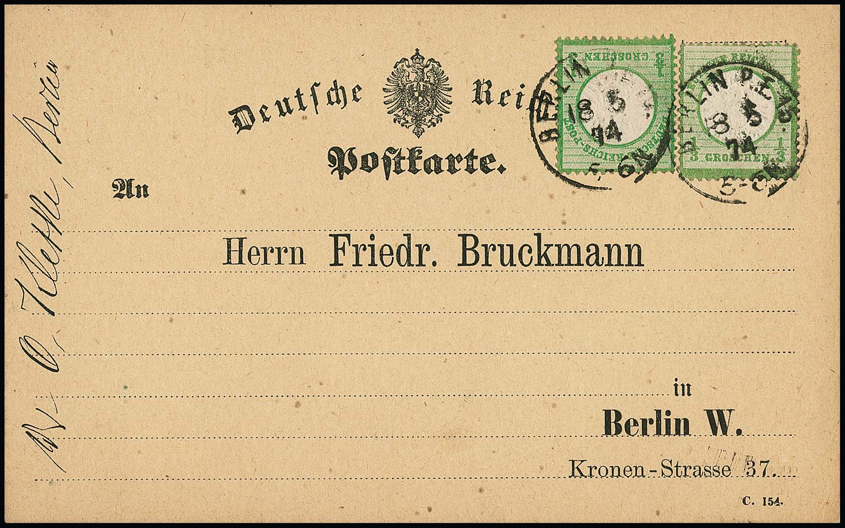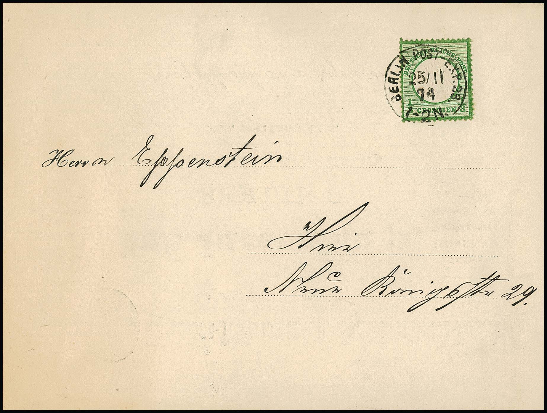 1/3 Gr. gelblichgrün per zwei auf Kabinett-Orts-Postkarte aus Berlin (Vordruck als Drucksachenkarte, wegen hs. Text nachfrankiert)