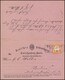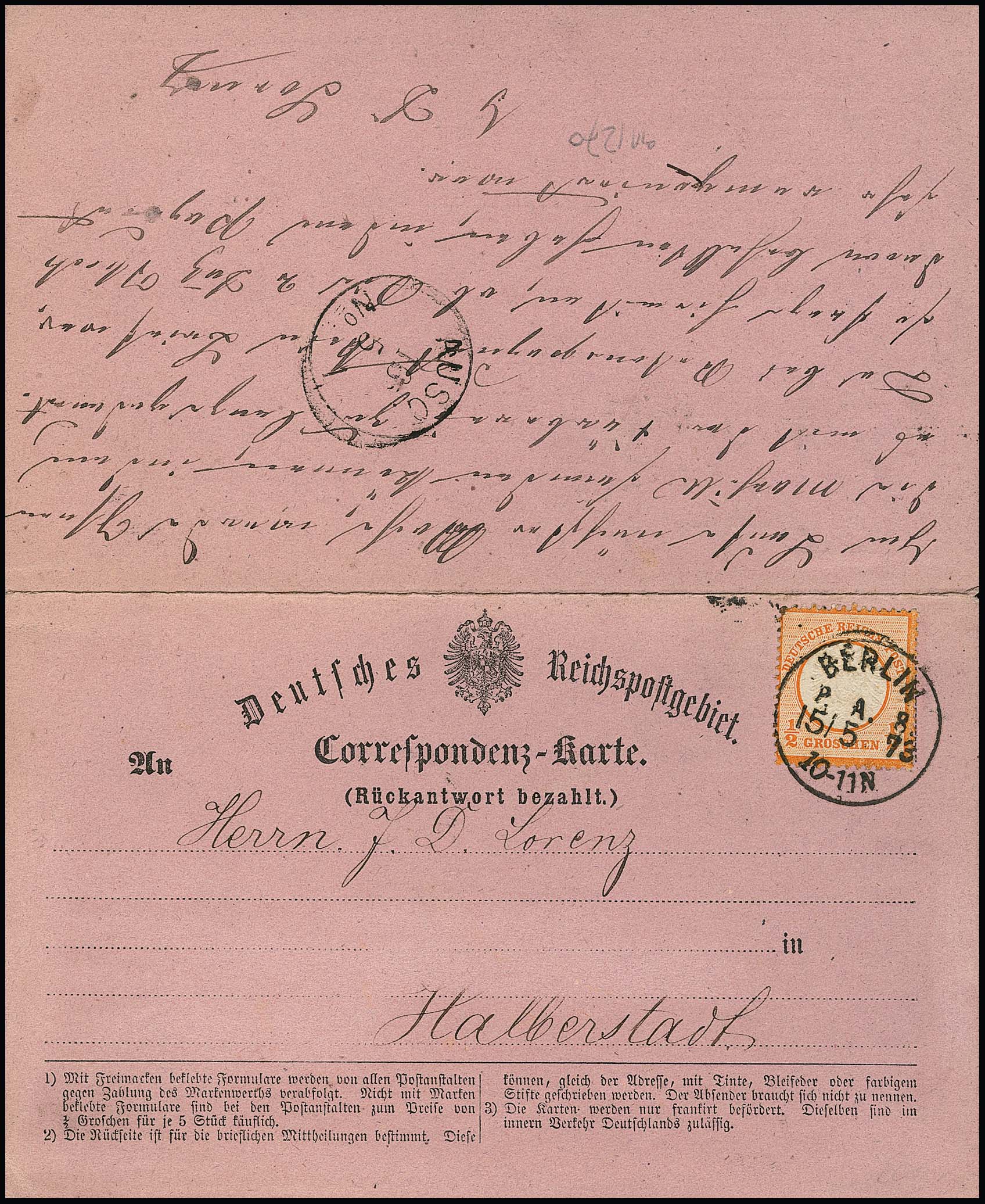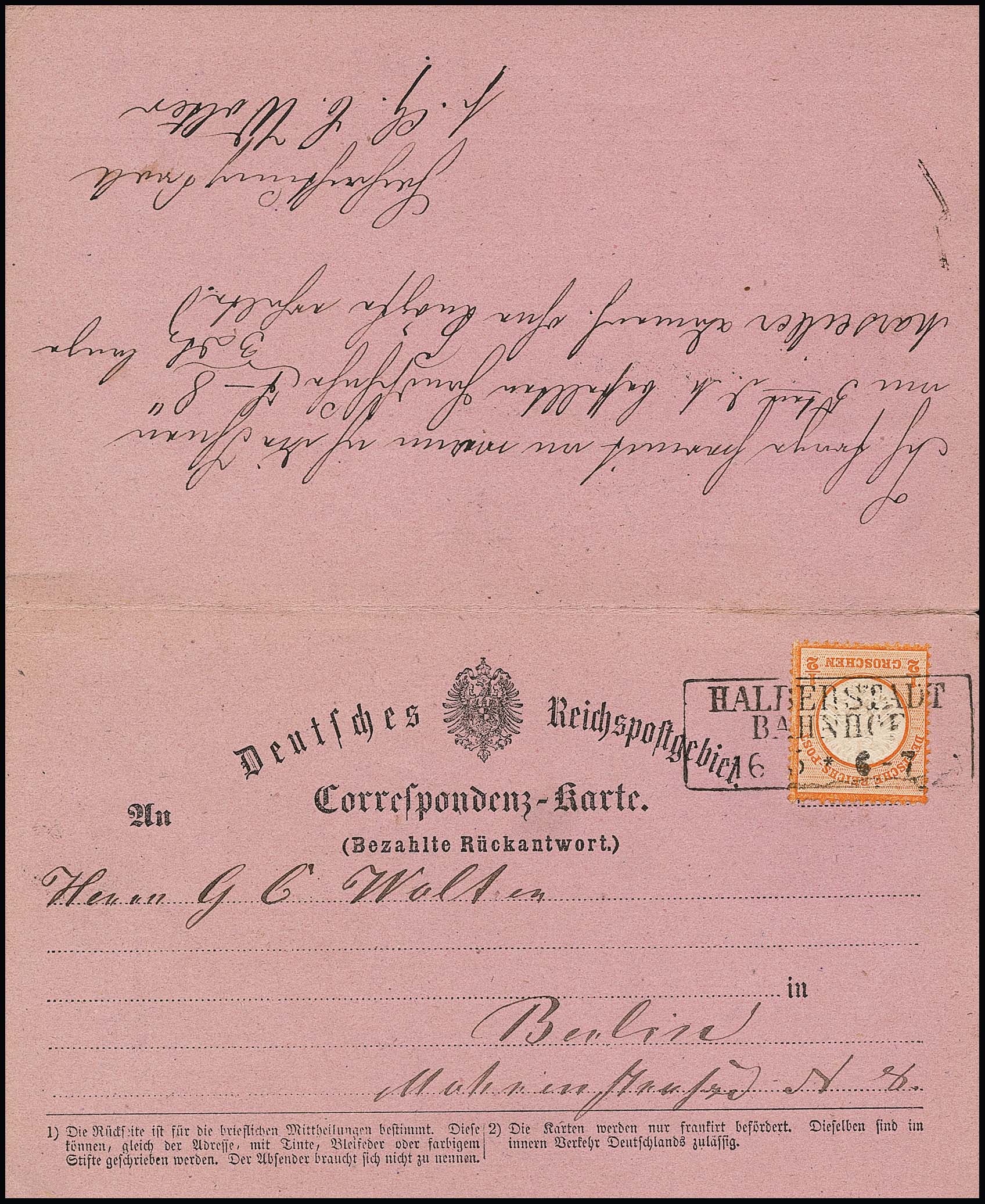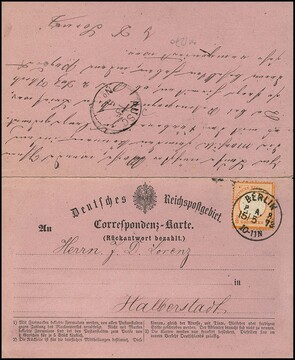 1/2 Gr. orange, je Kabinettstücke innen und aussen auf vollständig hin und her gelaufener violetter Doppel-Correspondenzkarte, mit K1 "Berlin P.A. 8" (Frageteil) bzw. Ra2 "Halberstadt Bahnhof" (Antwortteil), 1873