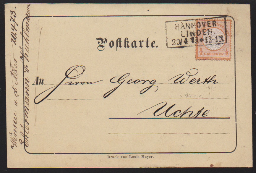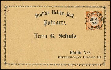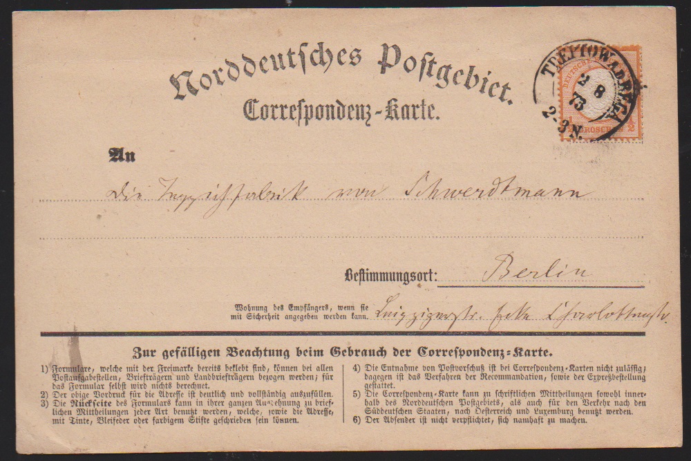 1/2 Gr. orange je einzeln auf drei Karten, einmal dekorativ mit Verzierung gedruckte Ortspostkarte aus Berlin, ferner auf Privat-Postkarte aus Hannover Linden, sowie spät 1873 auf NDP-Correspondenzkarten-Formular aus Treptow a.d. Rega (K2)