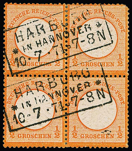 1/2 Gr. orange, seltener Viererblock mit Ra3 "Harburg in Hannover", kl. Zahnfehler, linke untere Marke Plattenfehler II von Feld 51 ("gebrochenes S von GROSCHEN")