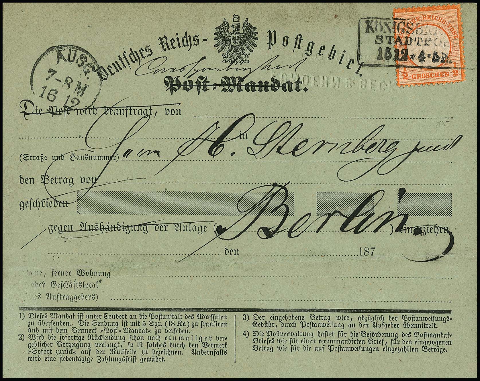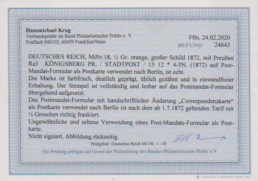 1/2 Gr. orange mit Ra3 "Königsberg Pr. Stadtpost" auf Post-Mandat-Formular, 1872 als Postkarte verwendet nach Berlin, ungewöhnliche Formular-Verwendung, "Post-Mandat" gestrichen und hs. geändert in "Correspondenzkarte". Fotoexp. Krug "einwandfrei"
