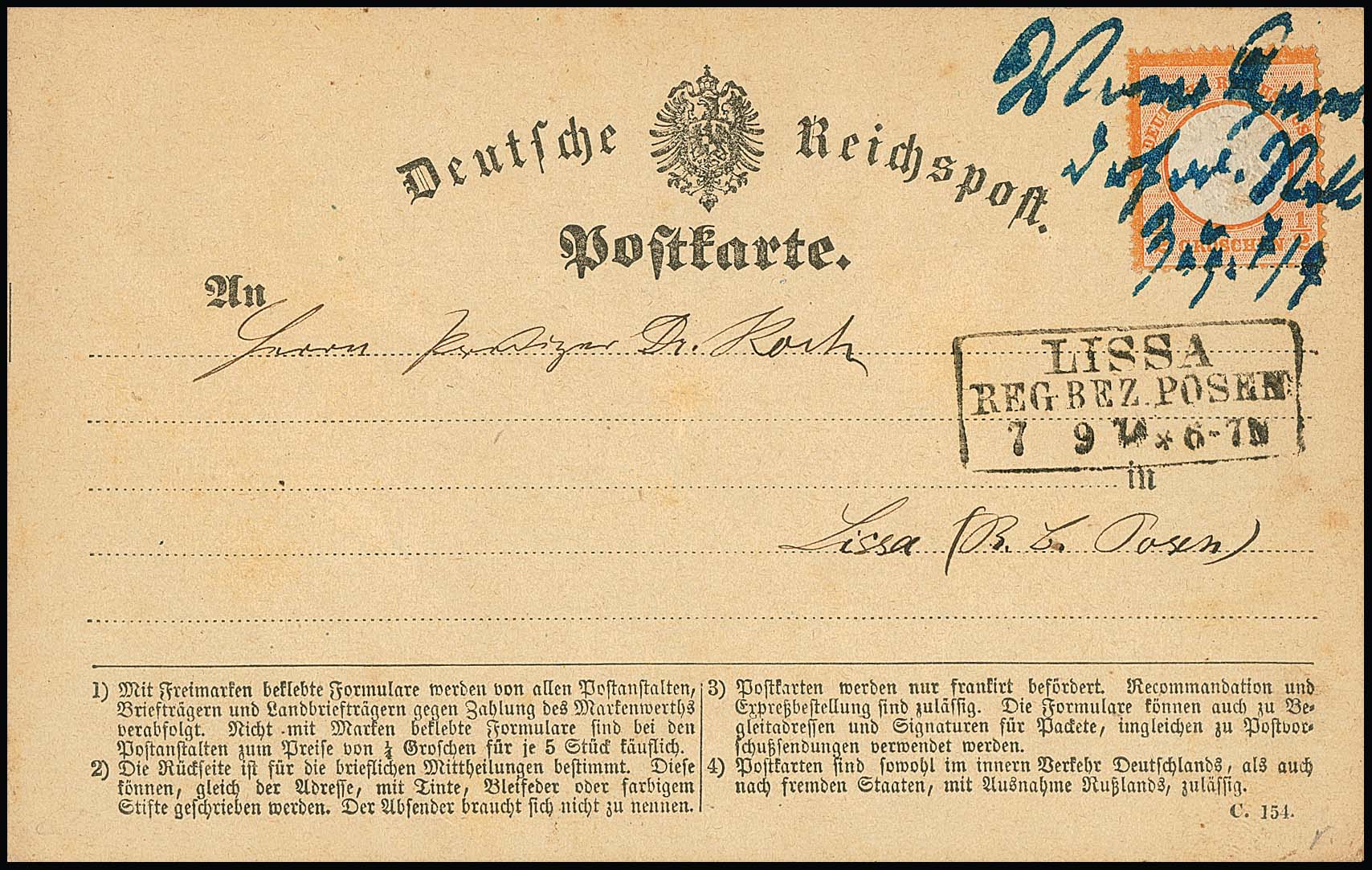 1/2 Gr. orange auf Bahnpostkarte mit ungewöhnlicher hs. Bahnpost-Entwertung "vom Hansdorfer Nachm. Zug" nach Lissa mit vs. Ra3