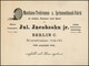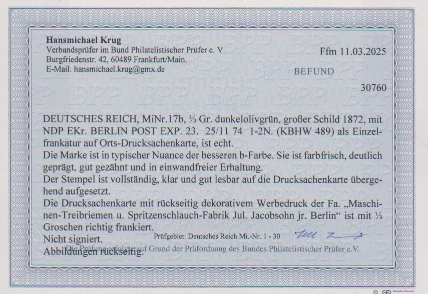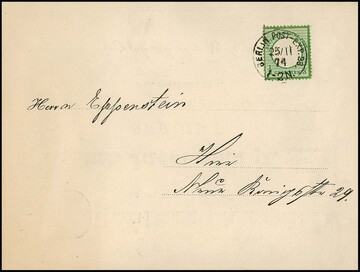 1/3 Gr. dunkelgrün einzeln auf Kabinett-Orts-Drucksachenkarte aus Berlin im größeren Format mit rückseitig dekorativem Vordruck einer "Maschinen-Treibriemen- und Spritzenschlauch-Fabrik", Fotoexp. Krug. Mi. 450,- +