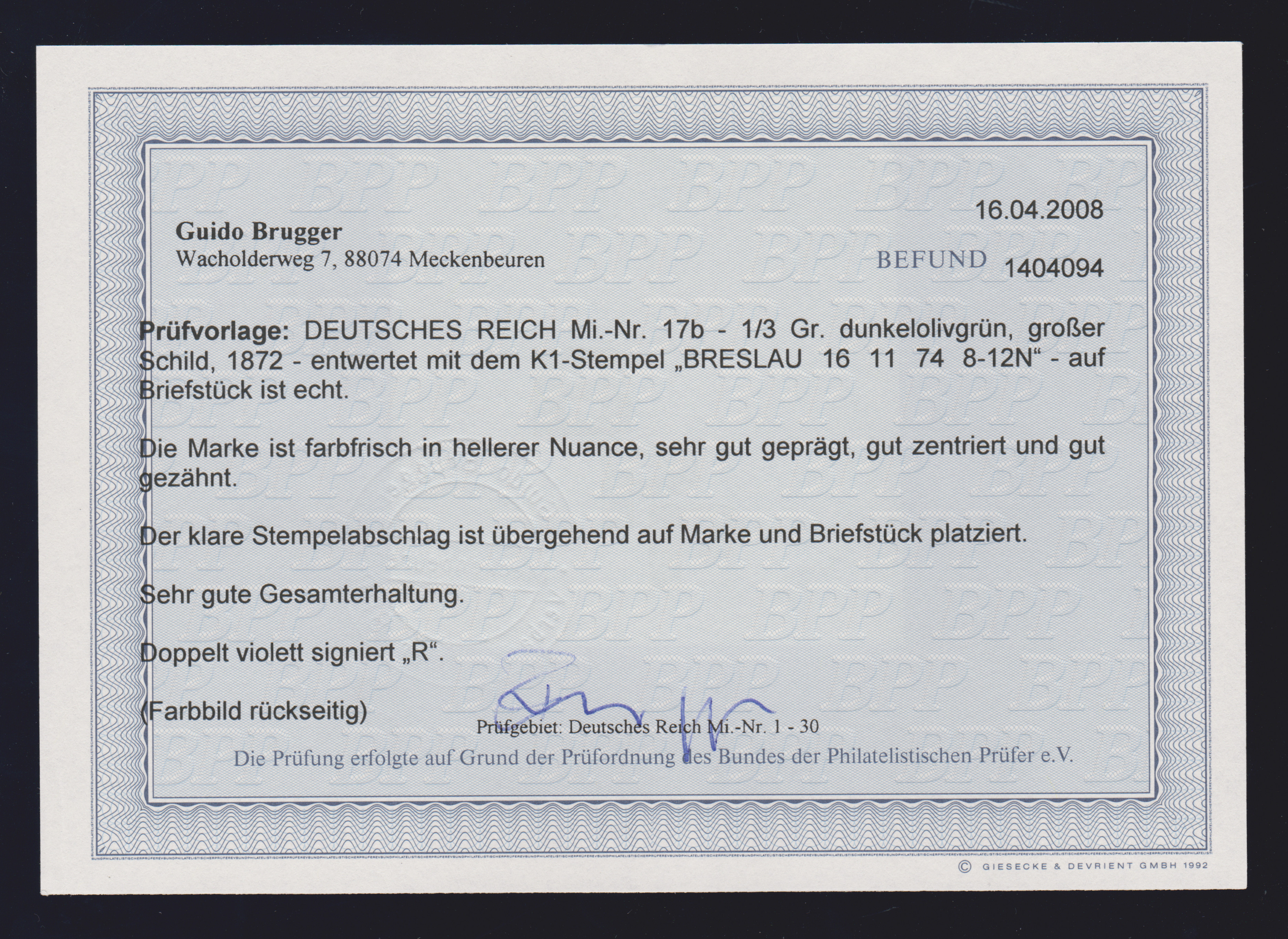 1/3 Gr. dunkelolivgrün, kleines Kabinettbriefstück mit K1 "Breslau", Fotoexp. Brugger. Mi. 180,-
