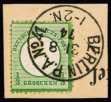 1/3 Gr. dunkelgrün auf Kabinettbriefstück mit klarem K1 "Berlin P.A. No. 41", sign. Sommer. Mi. 180,- +