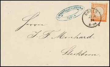 1/2 Gr. orange, normal gez. große Marke L16 vom Oberrand auf prachtvoller Auslands-Drucksache mit K1 "Coeln" 1874 in die Schweiz, deutlich versetzte Prägung