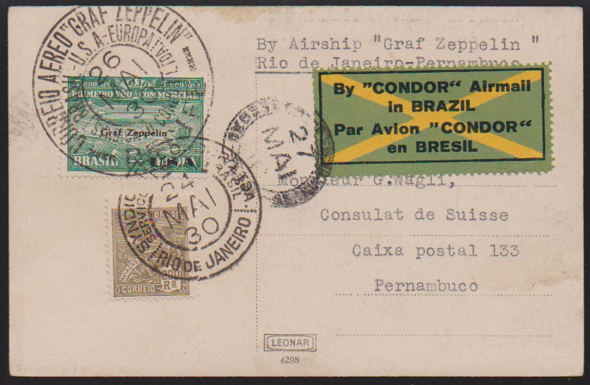 SAF 1930, zwei Karten Brasilianische Post, von der Heimfahrt mit Zeppelinmarken 20000 Rs. blau bzw. 5000 Rs. grün (Aufdruck "USA")