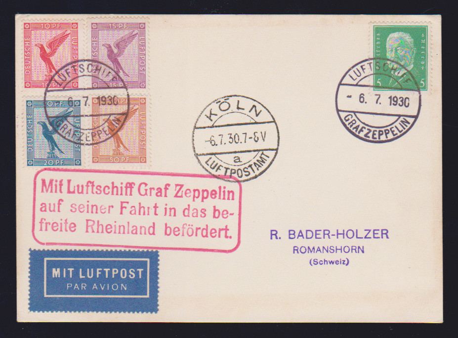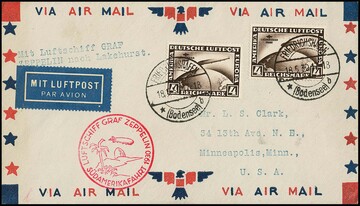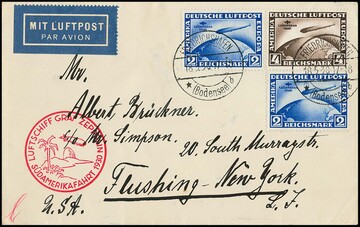 SAF 1930, Brief Friedrichshafen bis Lakehurst mit zweimal 2 RM SAF, davon eine mit Plattenfehler "Mond über Luftschiff", sowie 4 RM SAF. Mi. 1800,- + Sieger 675,-
