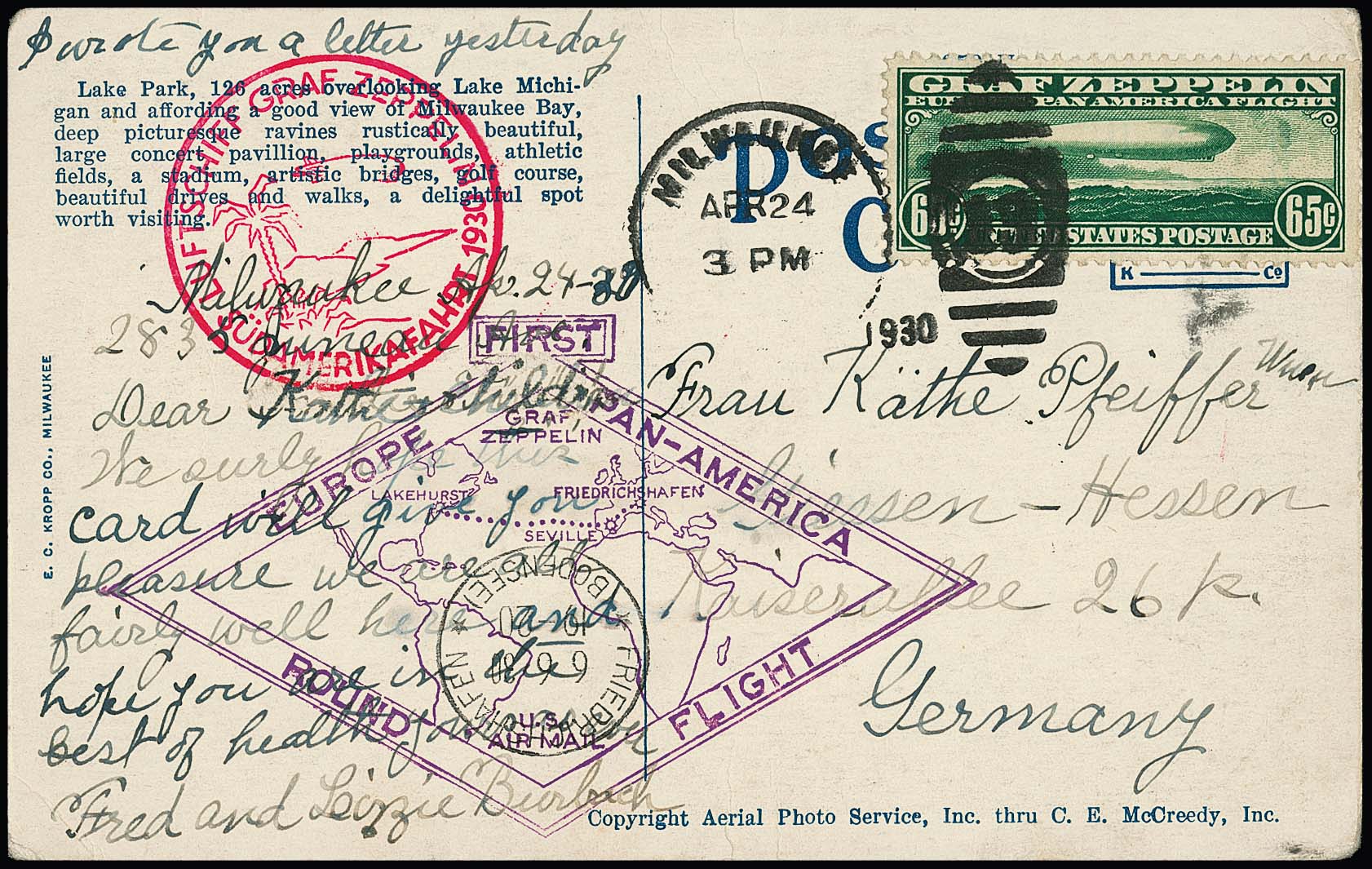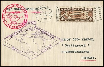 SAF 1930, Heimfahrt, Karte USA-Post mit Zeppelinmarke zu 1,30 Dollar, Sieger + 650,-