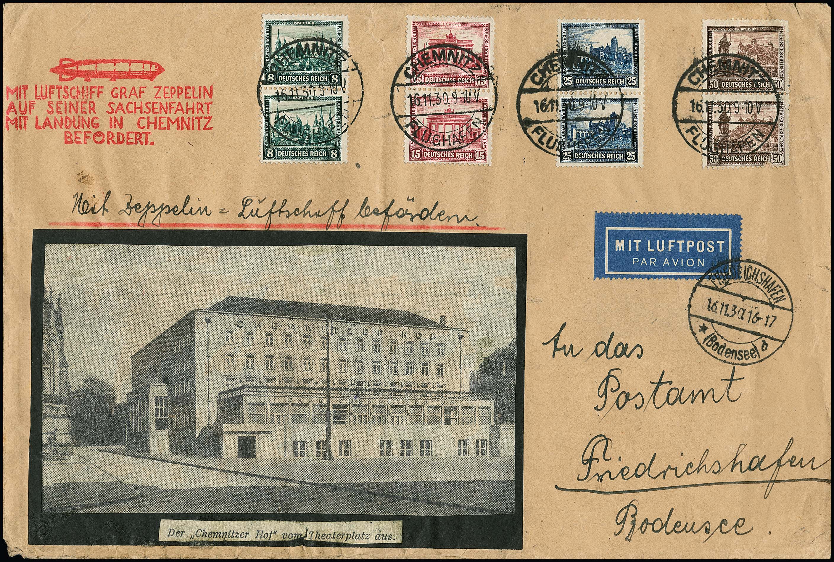 Landungsfahrt nach Chemnitz, 1930, Brief mit Paar-Serie Nothilfe 1930 (eine 50 Pfg. Kerbe), von Chemnitz, 16.11.30, nach Friedrichshafen