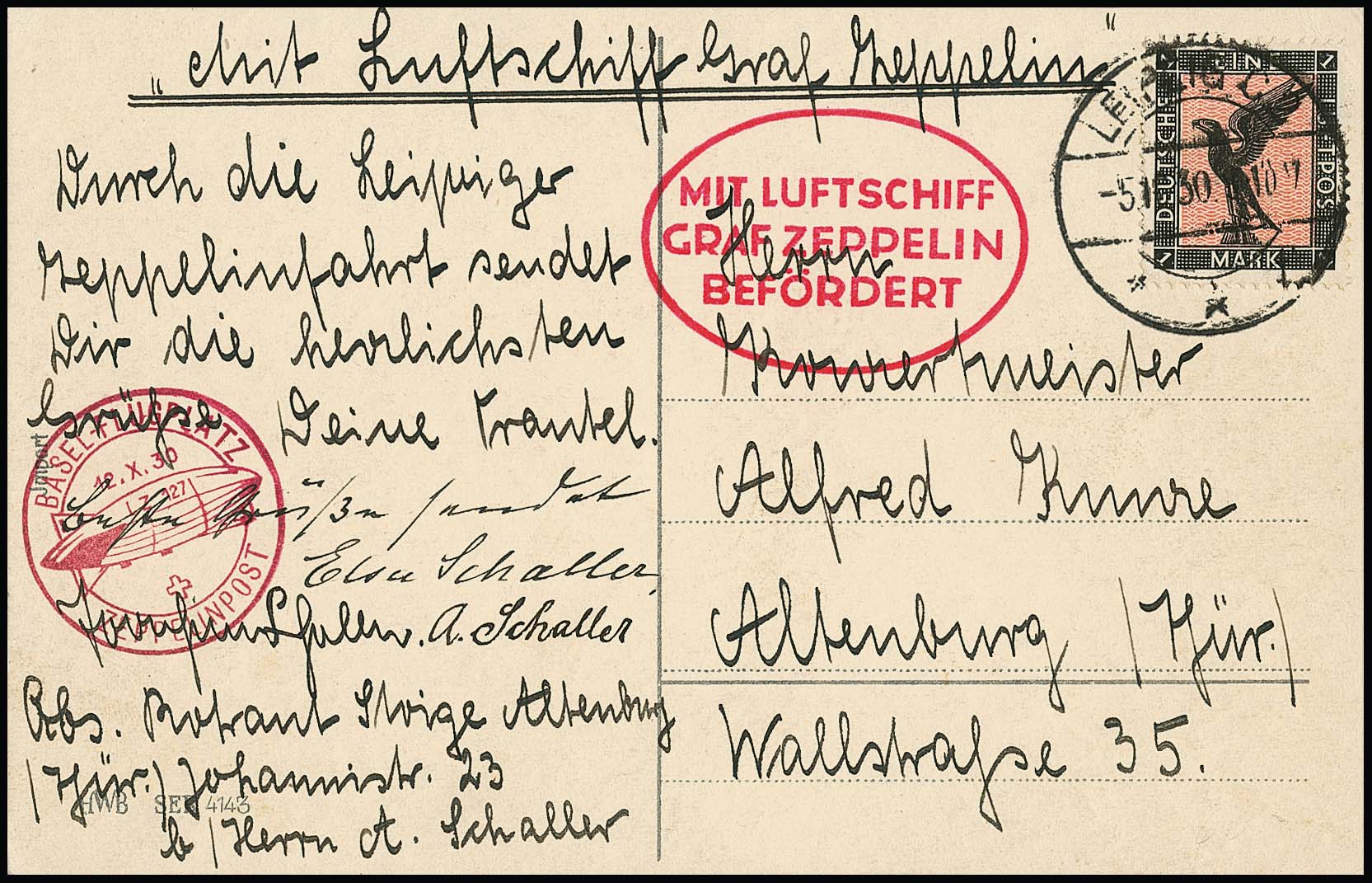 Rückfahrt Leipzig, Postkarte ab Leipzig mit 1 Mk. Flugpost über Friedrichshafen nach Basel, Sieger + 225,-