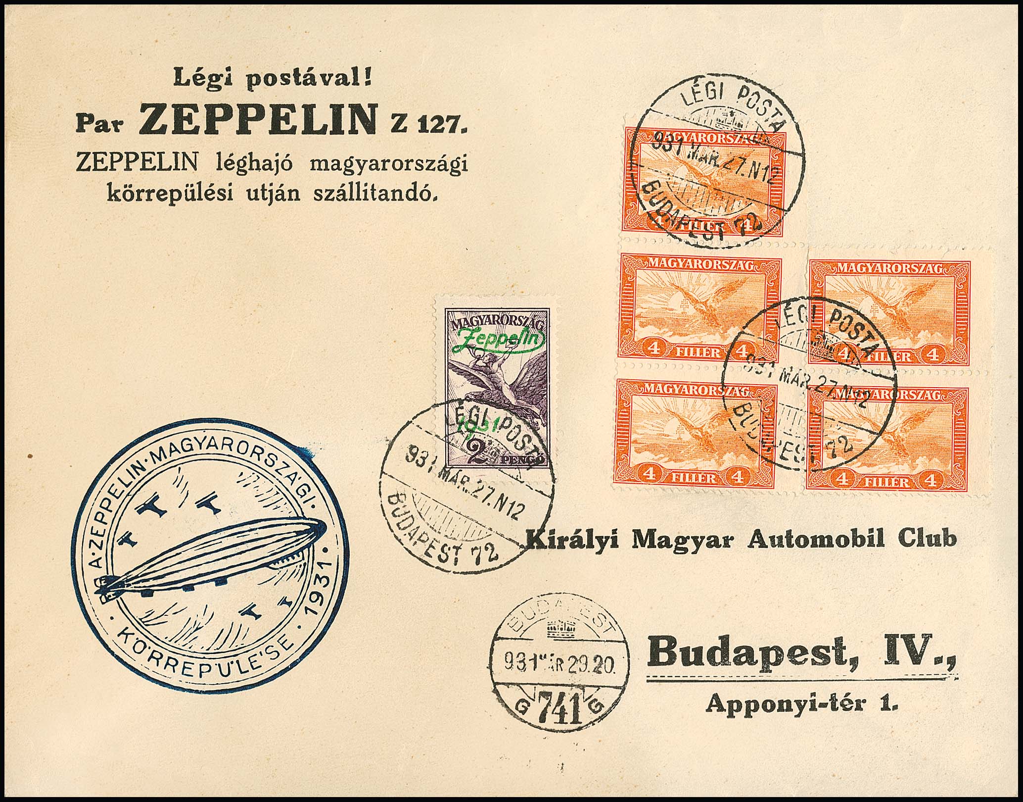 Landungsfahrt nach Ungarn, Brief Ungarische Post von der Rückfahrt mit beiden Zeppelin-Sondermarken und Sonderbestätigungsstempel in Type I
