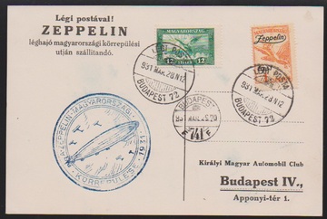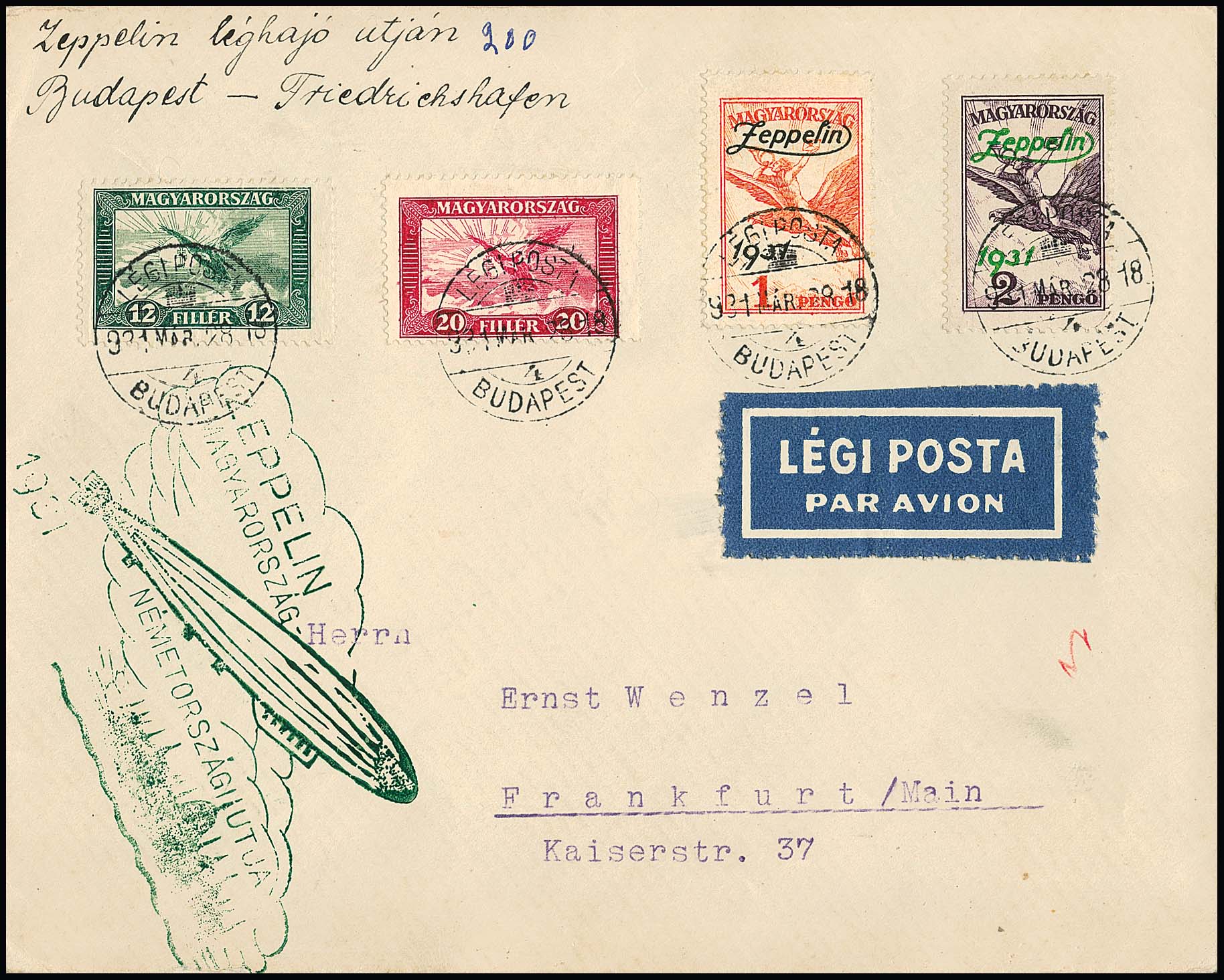 Landungsfahrt nach Ungarn, Karte und Brief Ungarische Post mit Zeppelin-Sondermarken zu 1 (Karte) bzw. 2 P. (Brief)