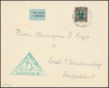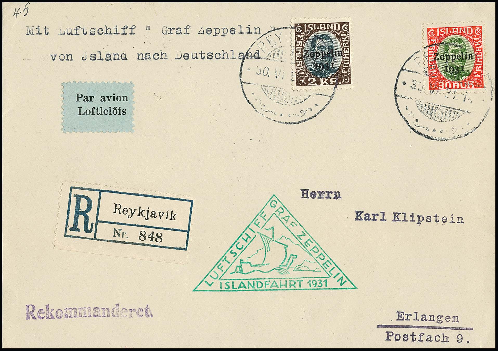 Islandfahrt 1931, Einschreibebrief Isländische Post mit Zeppelinmarken zu 30 Aur. und 2 Kr., Sieger + 465,-
