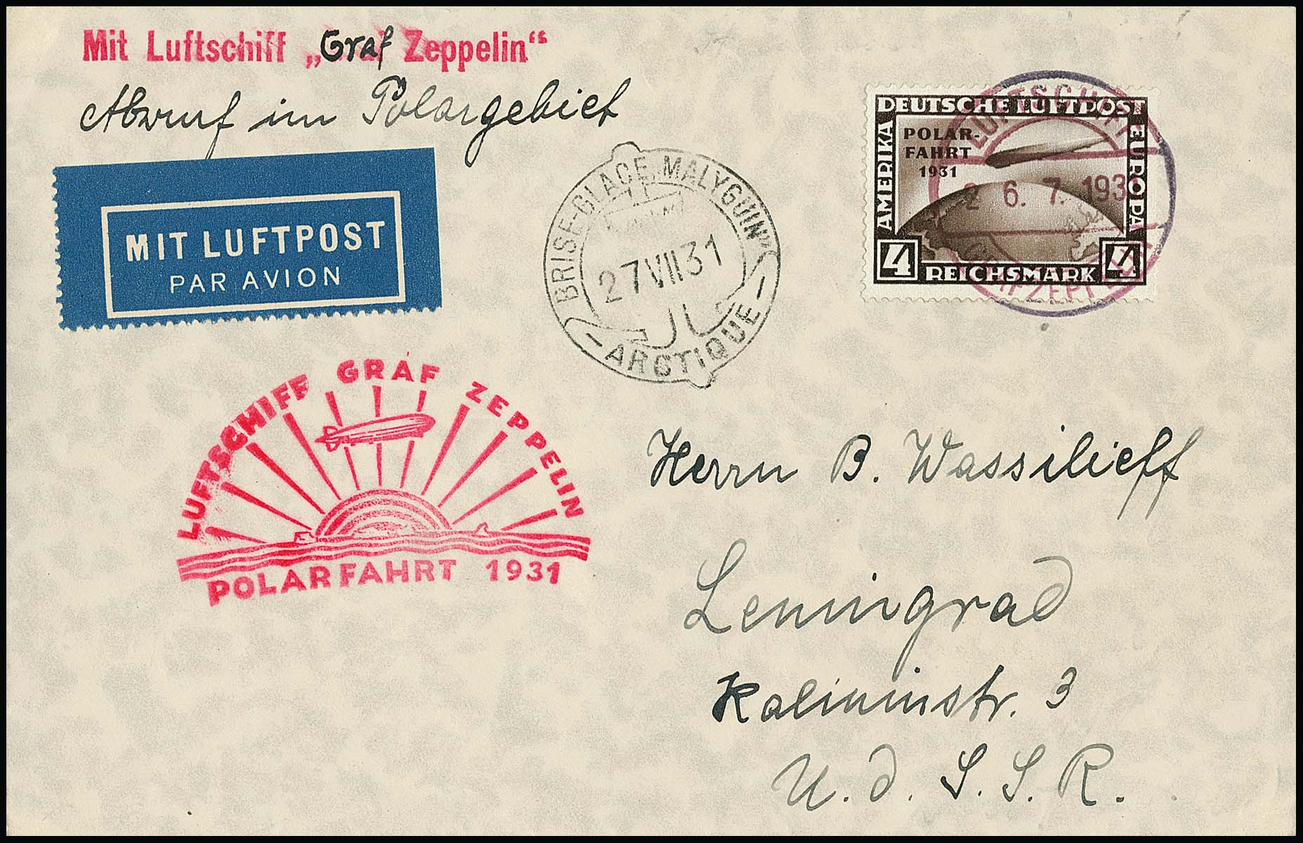 Polarfahrt, Postkarte und Brief, je Russische Post mit ungez. Zeppelinmarken eingeschrieben, Auflieferung "Malygin"