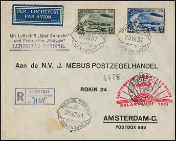 Polarfahrt, R-Brief Russische Post (leichte Gebrauchsspuren), Auflieferung Leningrad mit ungezähnten Marken