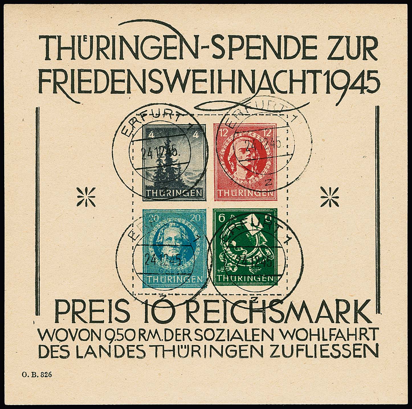 Weihnachtsblock auf t-Papier tadellos gestempelt "Erfurt 1z", Attest Ströh "einwandfrei". Mi. 3300,-