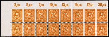 25 Pfg. orange im postfrischen Eckrand-16er-Block aus der linken oberen Bogenecke, die obere Reihe Abart "dreiseitig ungezähnt" (teilweise berührt die Zahnlochstanze das Papier, ohne durchzudrücken), linke obere Marke leichte Gummibüge und untere Reihe einmal angetrennt. Seltene Einheit. Mi. lose 10400,-