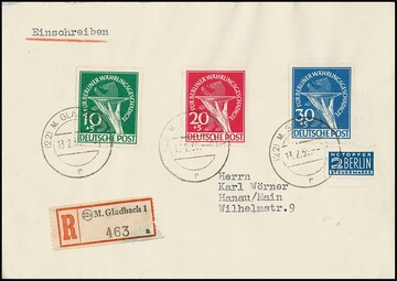Währungsgeschädigte auf portoger. R-Brief, als Besonderheit alle drei Werte jeweils mit Plattenfehlern: Nr. 68II, 69I und 70II, in dieser Form mit den beiden seltenen Plattenfehlern der 20 u. 30 Pfg. (Michel je "-.-", Nr. 68II lose = 700,-) wohl Unikat