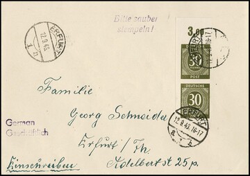30 Pfg. Ziffern, Abart "ungezähnt" im Paar aus der linken oberen Bogenecke auf Sammler-R-Couvert, Attest Schlegel. Mi. lose gestempelt 1300,- +