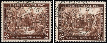 24 + 26 Pfg. Leipziger Messe, zwei Luxusstücke je mit zentrischem SST in den Zähnungen "D" und "E", beide mit Wasserzeichen-Abart "Stufen flach fallend", Attest bzw. Fotoexp. D. Schlegel. Mi. 1900,-