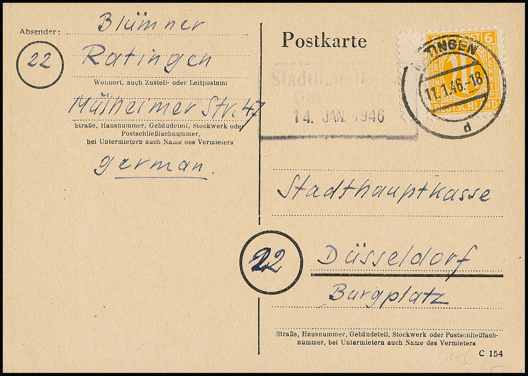 6 Pfg. mit Zwischensteg links auf portoger. Postkarte aus Ratingen, Fotoexp. Wehner
