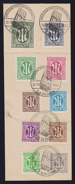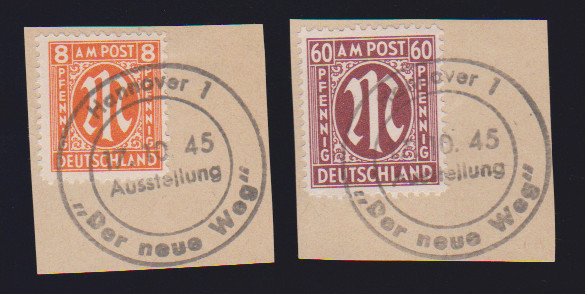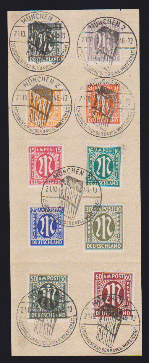AM-Post, Deutscher Druck, komplett auf Briefstücken einheitlich mit SST "München 2 - Leistungsschau der Bayer. Wirtschaft", 21.10.46, Mi. lose 900,- +