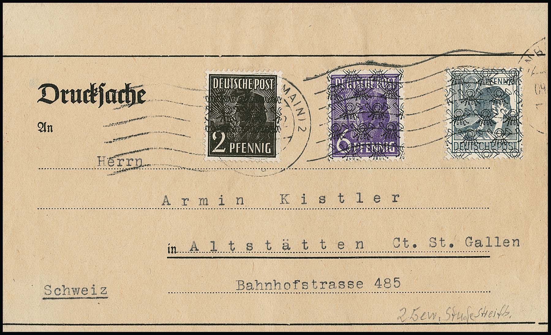 2 Pfg. Arbeiter-Bandaufdruck, nebst 6 u. 12 Pfg. Netz, als ungewöhnliche 20 Pfg.-Frankatur auf Auslands-Streifband der 2. Gewichtsstufe von Frankfurt nach St. Gallen/Schweiz. Mi. 350,-