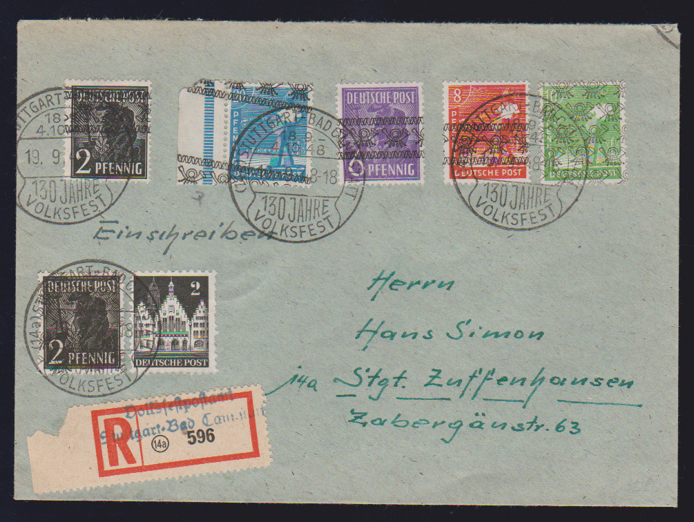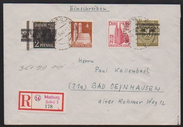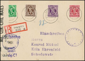 5, 10, 12 u. 15 Pfg. AM-Post (Nr. 19Bz, 22Bz, 23Az und 24Az) auf portoger. R-Brief vom Postamt Leipzig nach Köln. Die Marken waren in der SBZ ungültig und wurden offensichtlich als Rückporto für eine Anfrage akzeptiert und unbeanstandet verwendet. Fotoexp. Wehner