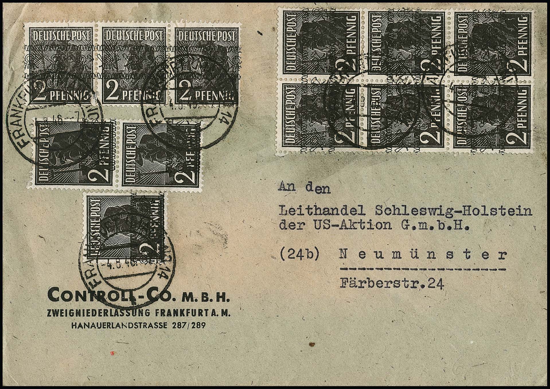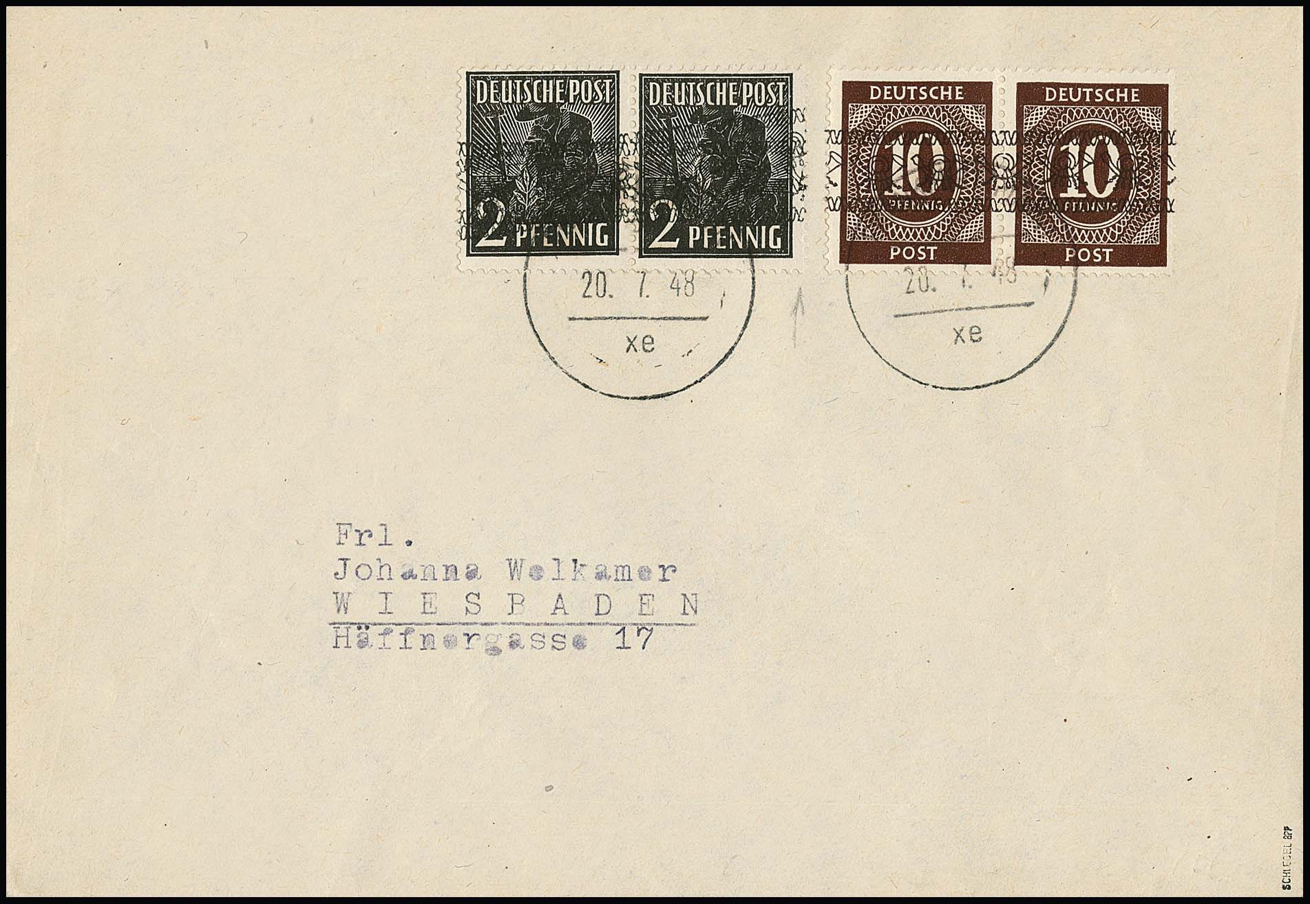 2 Pfg. Arbeiter mit doppeltem Bandaufdruck, nebst 30 Pfg. Ziffern-Band sowie 4 Pfg. Bauten und 24 Pfg. Kölner Dom, auf R-Brief, ferner im Paar mit doppeltem Bandaufdruck, davon einer diagonal, nebst Paar 10 Pfg. Ziffern-Band, auf Brief aus München, je sign. Schlegel