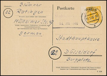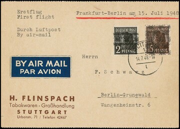2 Pfg. Arbeiter-Bandaufdruck und 15 Pfg. Netzaufdruck als seltene Portorate auf Lupo-Postkarte von Stuttgart, 14.7.48, nach Berlin, Handbuch 900,- Euro