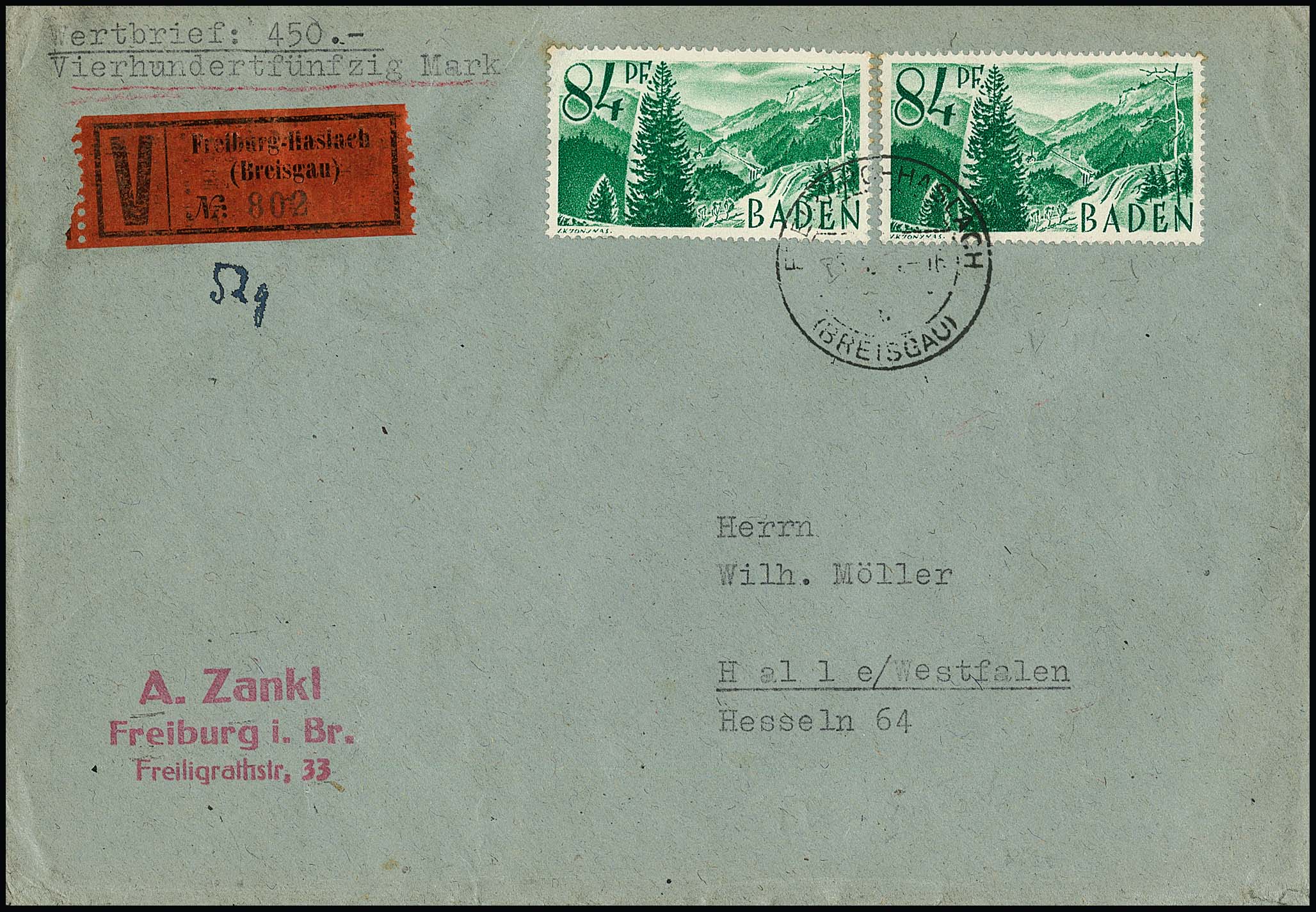 84 Pfg. per zwei als gute Mehrfach-Frankatur auf Wertbrief ab Freiburg-Haslach, 8.3.48, nach Halle/Westf.