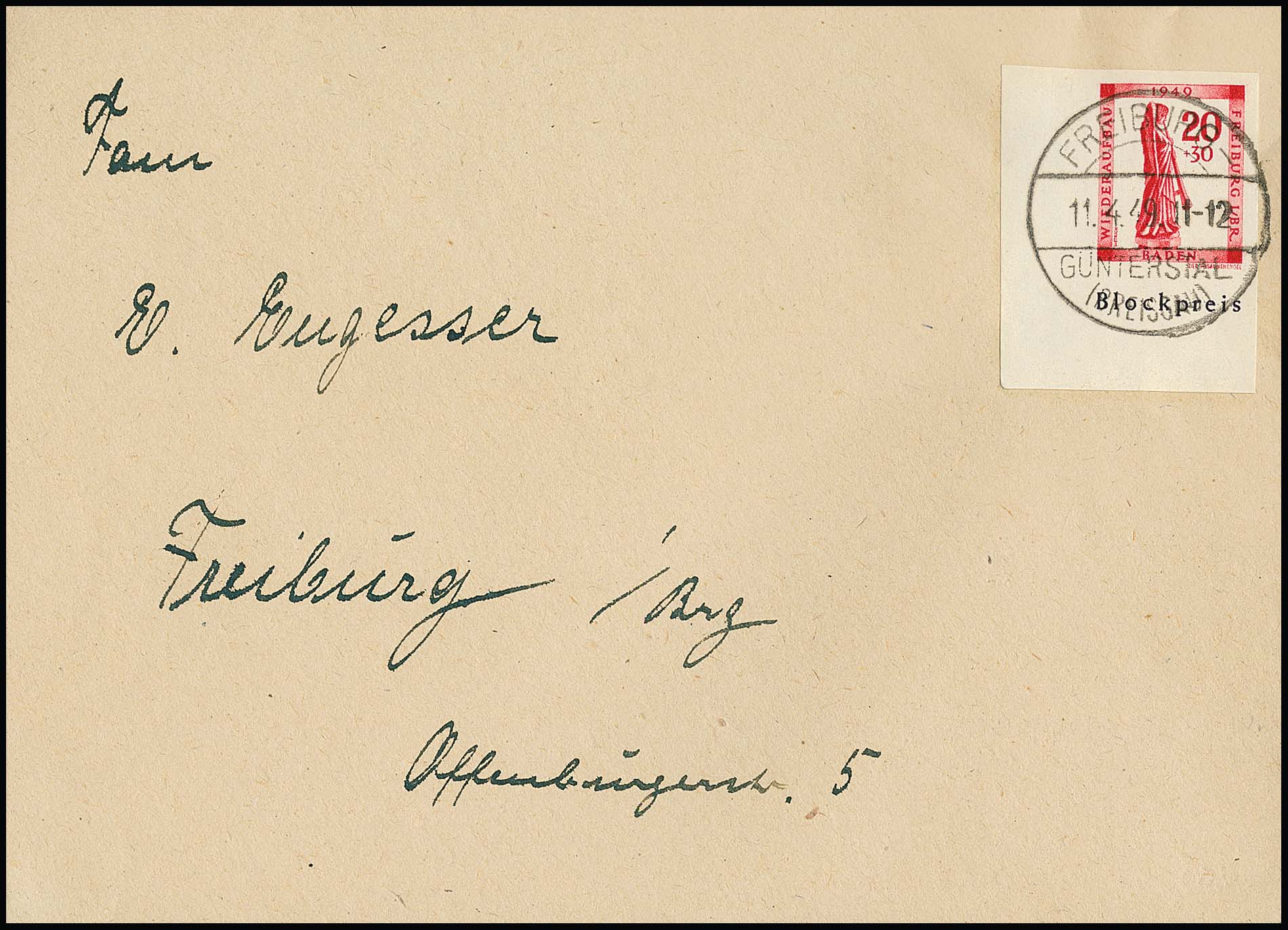 20 + 30 Pfg. Wiederaufbau, geschnittene Marke aus Block als Ecke auf sauber gestempeltem Orts-Doppelbrief aus Freiburg-Günterstal, seltene Einzelfrankatur-Variante. Mi. "-.-"