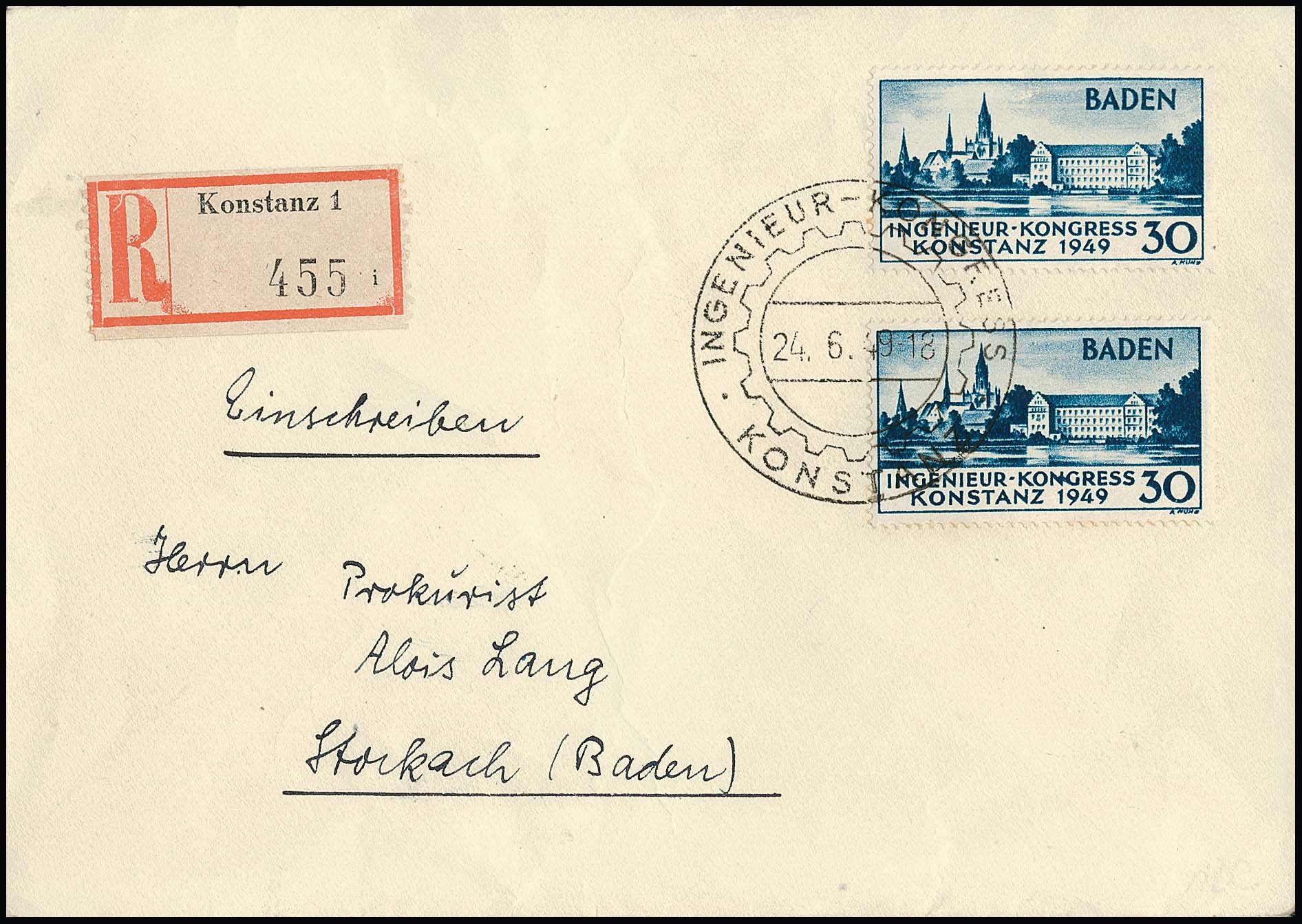 30 Pfg. Konstanz I als gute Mehrfach-Frankatur auf R-Brief ab Konstanz, 24.6.49, mit SST