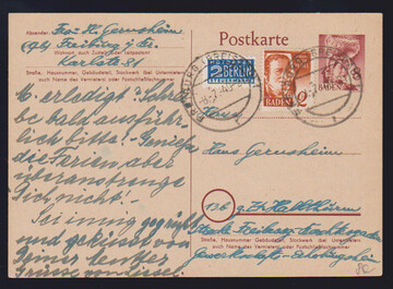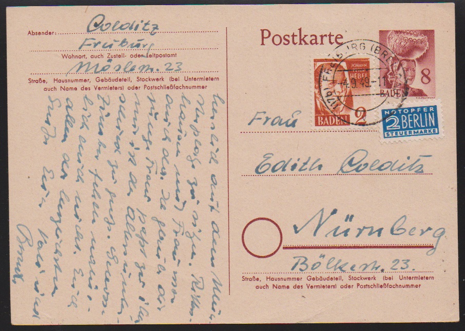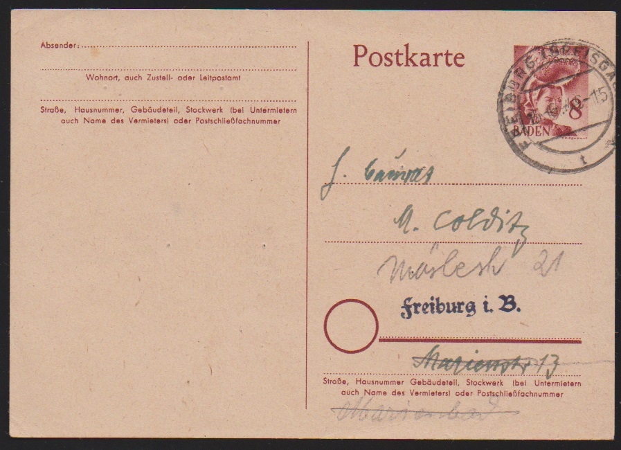 2 Pfg. auf seltener Ganzsachenkarte 8 Pfg., von Freiburg 1949 als Fernkarte