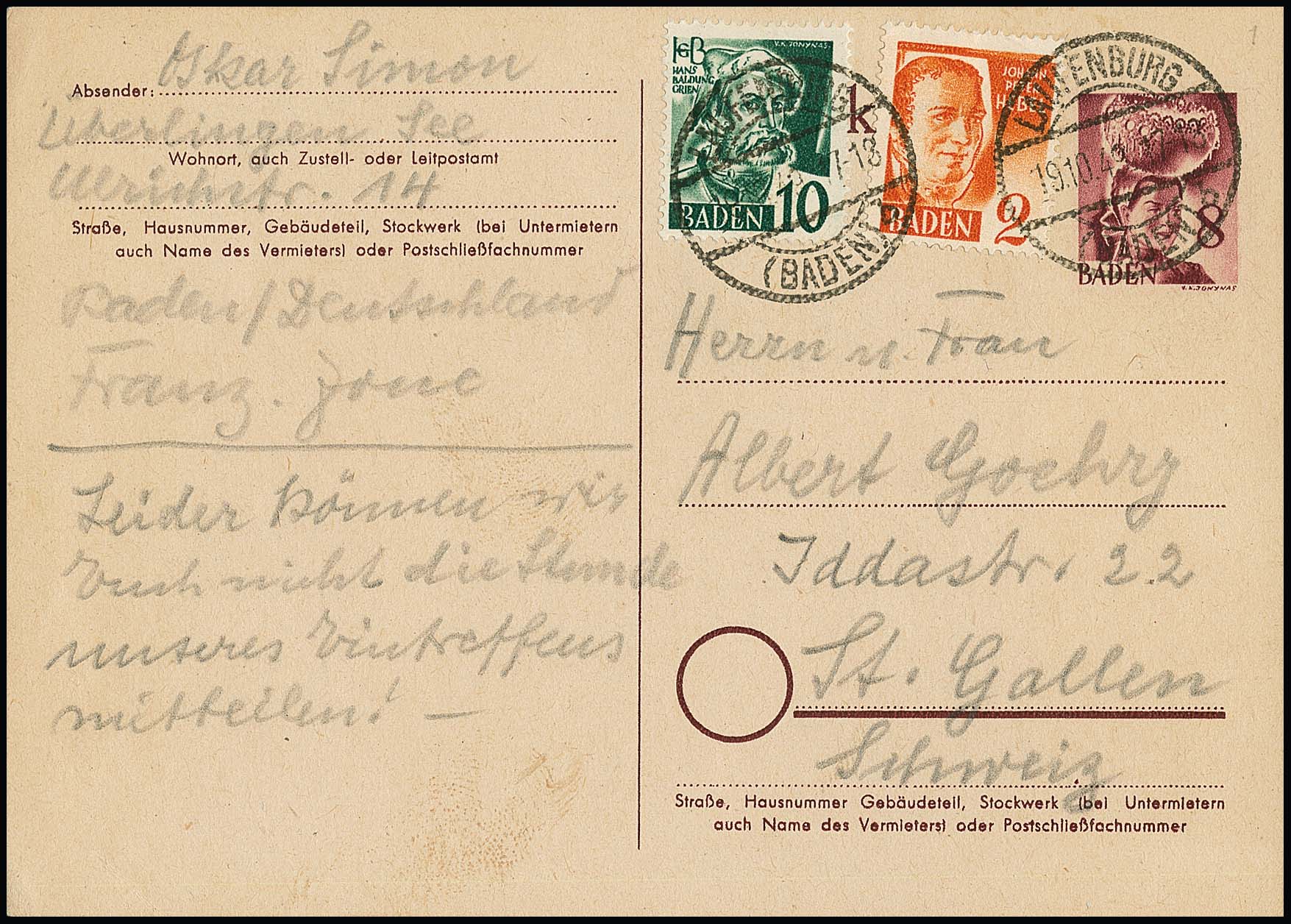 Ganzsachenkarte 8 Pfg. gebraucht als Ortskarte aus Freiburg, ferner mit ZuF 2 Pfg. als Fernkarte nach Nürnberg, sowie mit 2 und 10 Pfg. als Auslandskarte nach St. Gallen, drei versch. Verwendungen dieser seltenen Ganzsachenkarte!